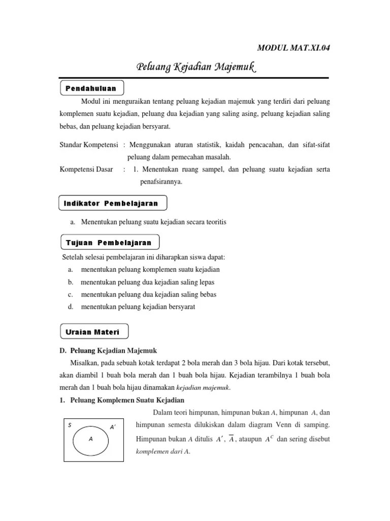 Suatu kejadian $e$ dan kejadian komplemennya $e'$ memenuhi persamaan . Suatu kejadian k dan kejadian k komplemen (yang . Peluang kejadian majemuk komplemen contoh: P(ac) = peluang komplemen suatu kejadian a. Peluang tidak munculnya angka 3 pada pelemparan sebuah dadu adalah:.